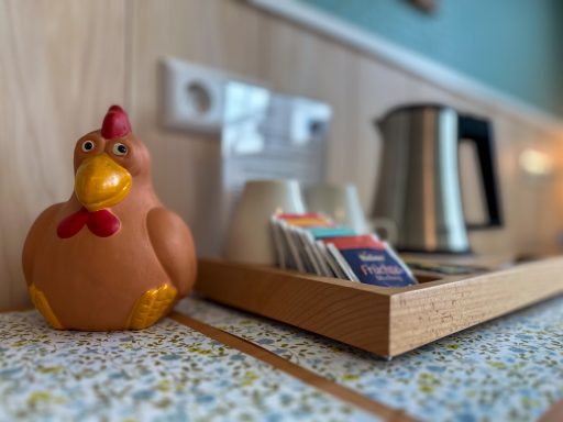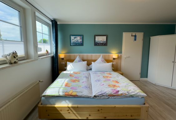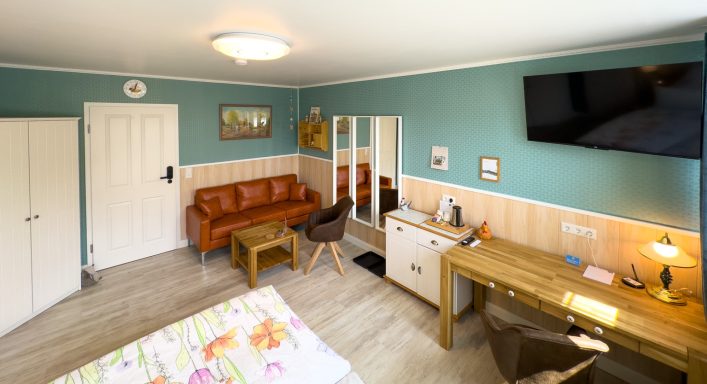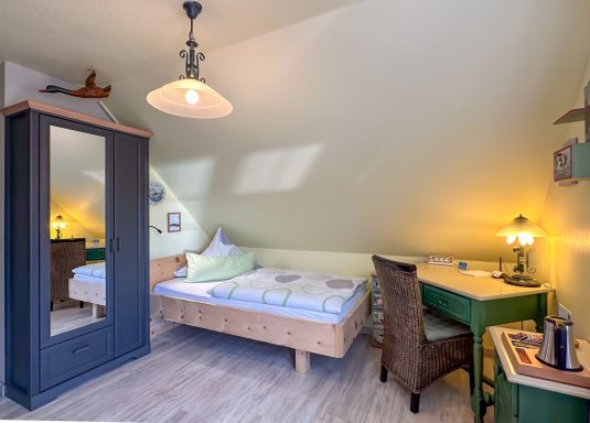 Freundliches kleines Einzelzimmer (Bett 100cm x 200cm) mit Balkon in Grüntönen gehalten mit DU/WC, Flachbild TV, Fön, Kosmetikspiegel und Heisswasserspender, Kaffee&Tee kostenfrei. Insektenschutz an den Fenstern. Alle Fenster und Terrassentüren mit Jalousien. Ausblick auf die Deichlandschaft. Hundefreundliches Zimmer.